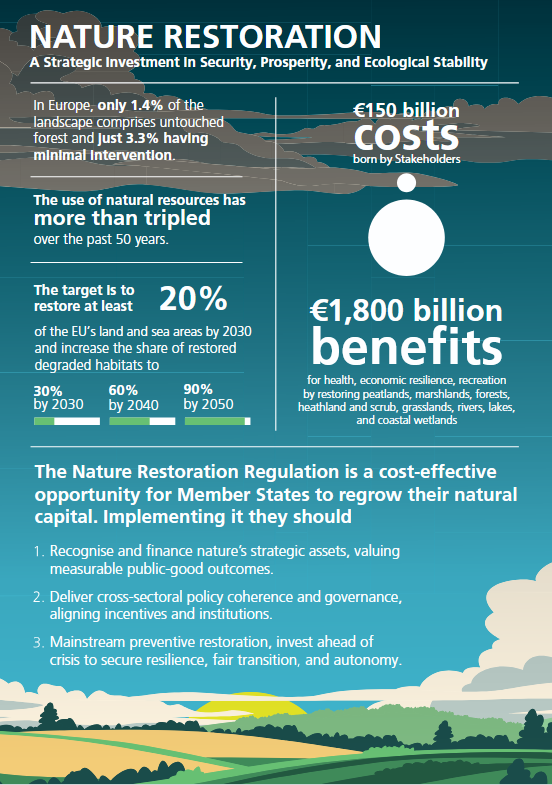 The Commentary 'Opportunities in Nature Restoration' finds that the estimated cost of restoring Europe’s ecosystems – around EUR 150 billion – is vastly outweighed by benefits at least ten times higher, including avoided disaster losses, improved public health, strengthened food and water security, and enhanced climate resilience.